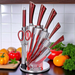 - Komplet set: Veliki nož/satara, kuvarski nož, nož za hleb, nož za seckanje, nož za čišćenje, makaze i oštrač.